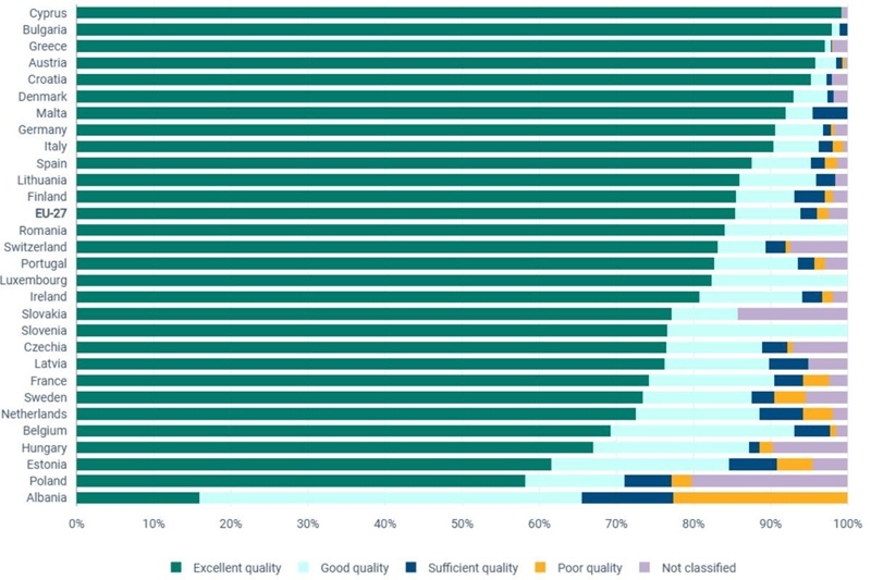 Am anderen Ende der Skala verzeichnete Albanien die schlechtesten Wasserqualitätsergebnisse der Untersuchung: Nur 16 Prozent der Standorte wurden als ausgezeichnet bewertet, 23 Prozent als schlecht. Die schlechten Ergebnisse sind vor allem auf eine unzureichende Abwasserbehandlung zurückzuführen, die weiterhin Auswirkungen auf Küsten- und Binnengewässer hat.
