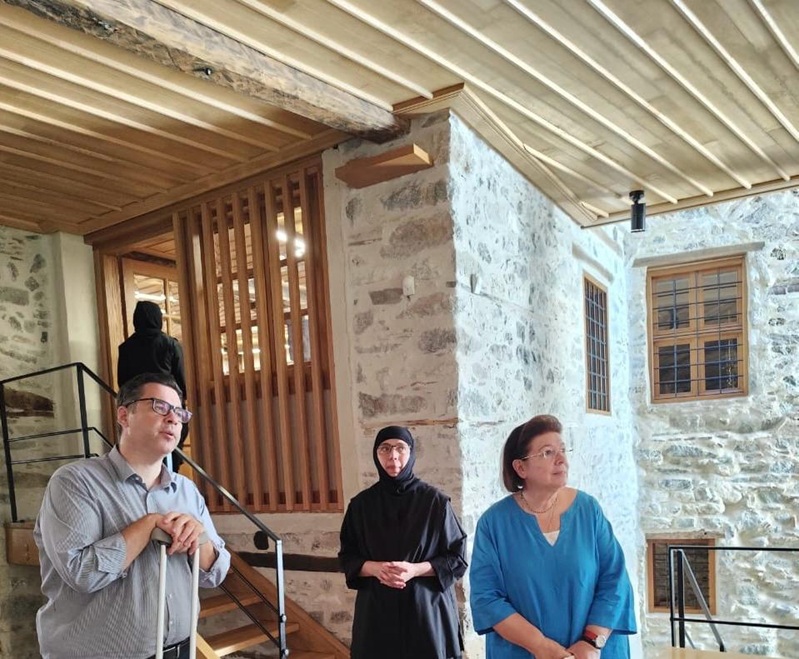 Der stellvertretende Minister des Premierministers Thanasis Kontogeorgis und Lina Mendoni im Kloster Timios Prodromos. Fotoquelle: Kulturministerium