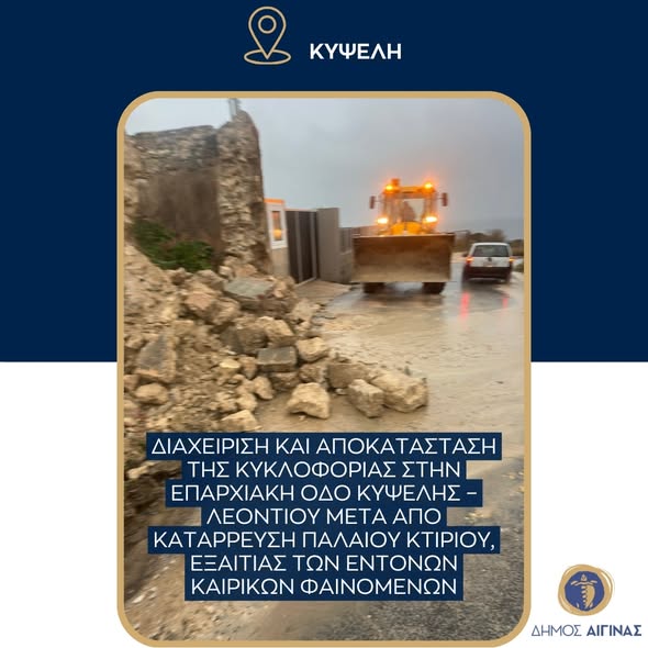 - Pflege der Palmen am Strand von Aegina, Verwaltung und Wiederherstellung des Verkehrs auf der Landstraße von Kypseli – Leontios nach dem Einsturz eines alten Gebäudes aufgrund starker Wetterereignisse,
